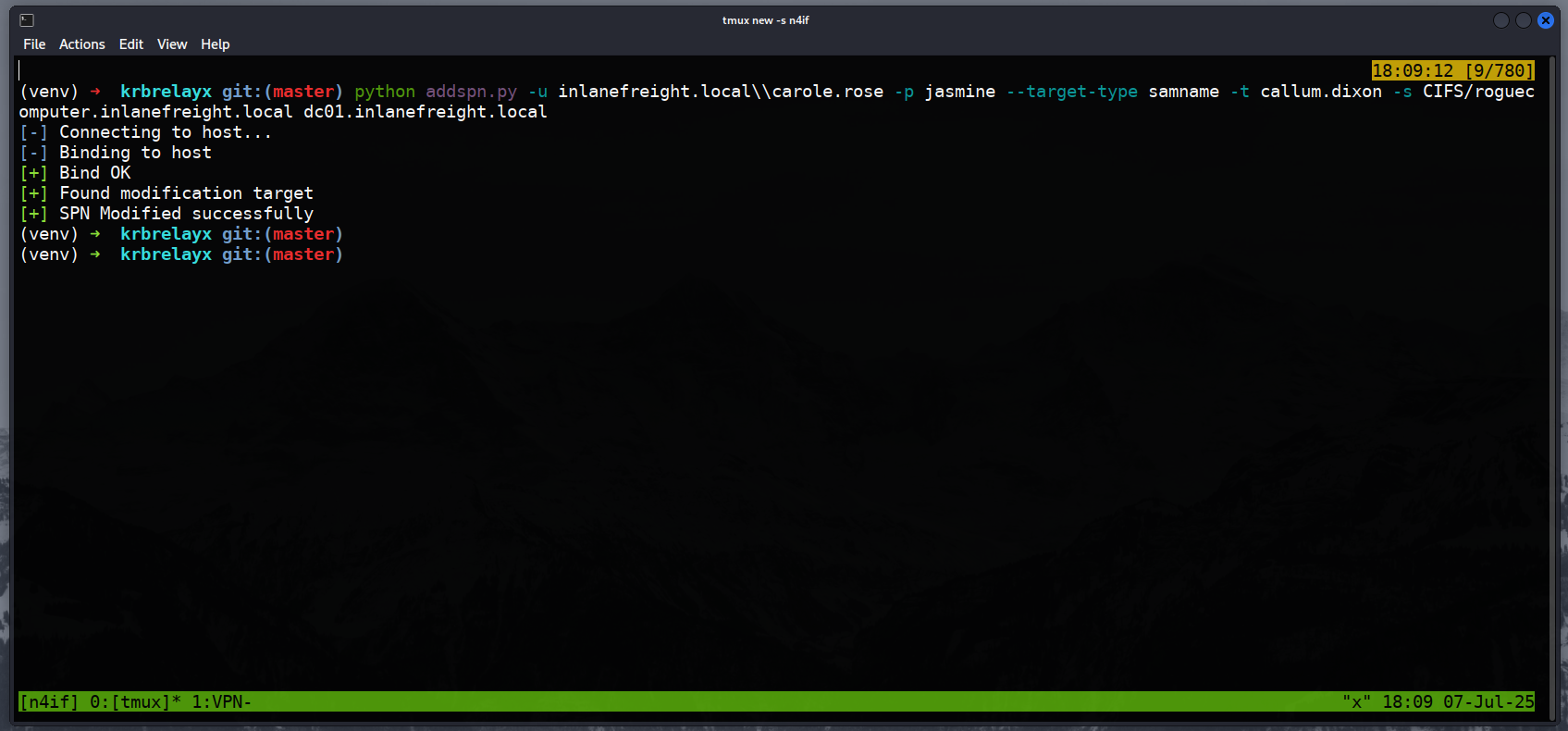 We do this by editing sqldev’s SPN to say he is now also roguecomputer. When we force the DC to authenticate to roguecomputer, it’s actually sending its TGT straight to our user, sqldev, letting us steal it.