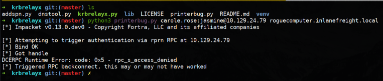 I will target DC using The Printer Bug This coerces the DC to try and authenticate to roguecomputer over SMB.
