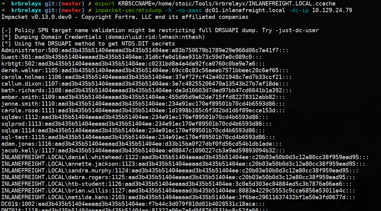 It automatically saves this TGT to a .ccache file. from Kali we can import the powerful DC TGT to our session and work remotely. using -K for kerberos authenticate and -no-pass to stop the regular authenticate